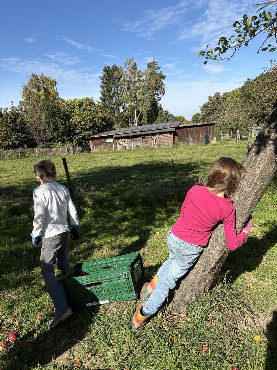 Die vollen Körbe wurden zur Saftpresse gebracht – dort konnten die Kinder miterleben, wie aus ihren Äpfeln frischer, goldgelber Saft wurde.